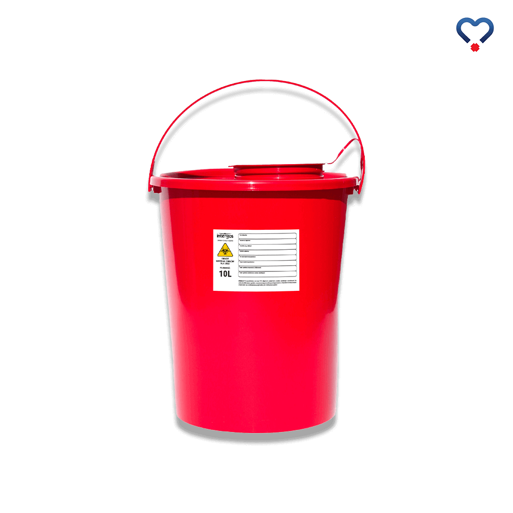Czerwony pojemnik na odpady medyczne (typu wiadro) o pojemności 10 l, dedykowany jest do gromadzenia materiałów opatrunkowych, różnych ostrzy (od lancetów, skalpele, żyletki), igieł oraz strzykawek po pobraniach czy iniekcjach itp.