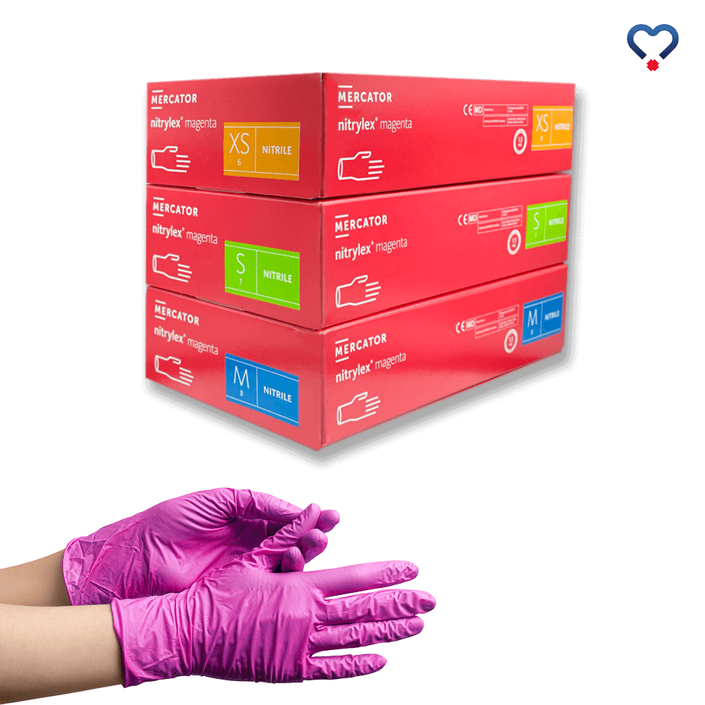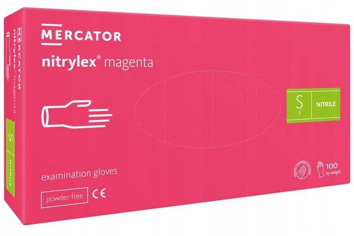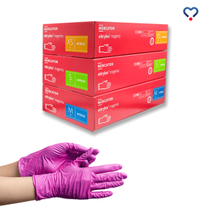 Uniwersalne rękawice diagnostyczne w kolorze różowym, zbliżonym do koloru fuksji (magenta). Produkt nitrylowy, bezpudrowy, niesterylny. Popularne w gabinetach medycznych, stomatologicznych oraz kosmetycznych.